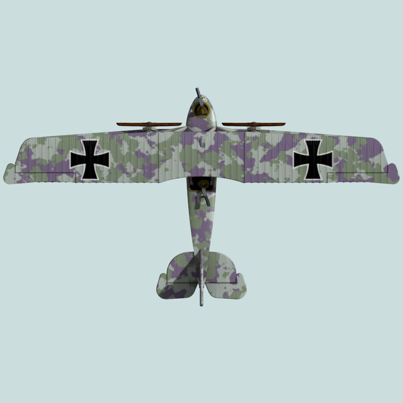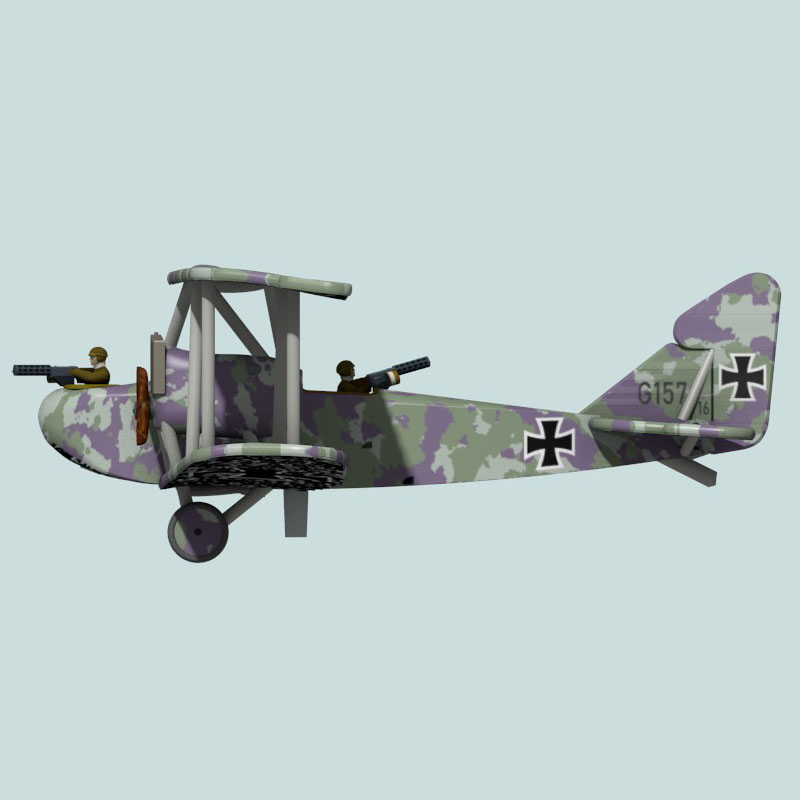 This is a full-color 1:144 3D print of A.E.G. G.IV 157/16 of Kagohl IV. Early G.IVs, during the period that they were flying more daytime bombing missions, were painted in daylight-suitable camouflage, like this irregular blend of greens and lilac. When they started shifting to missions in the dusk, dawn, and night, camouflage changes became necessary, like the patchy black paint applied to this plane’s undersurfaces.