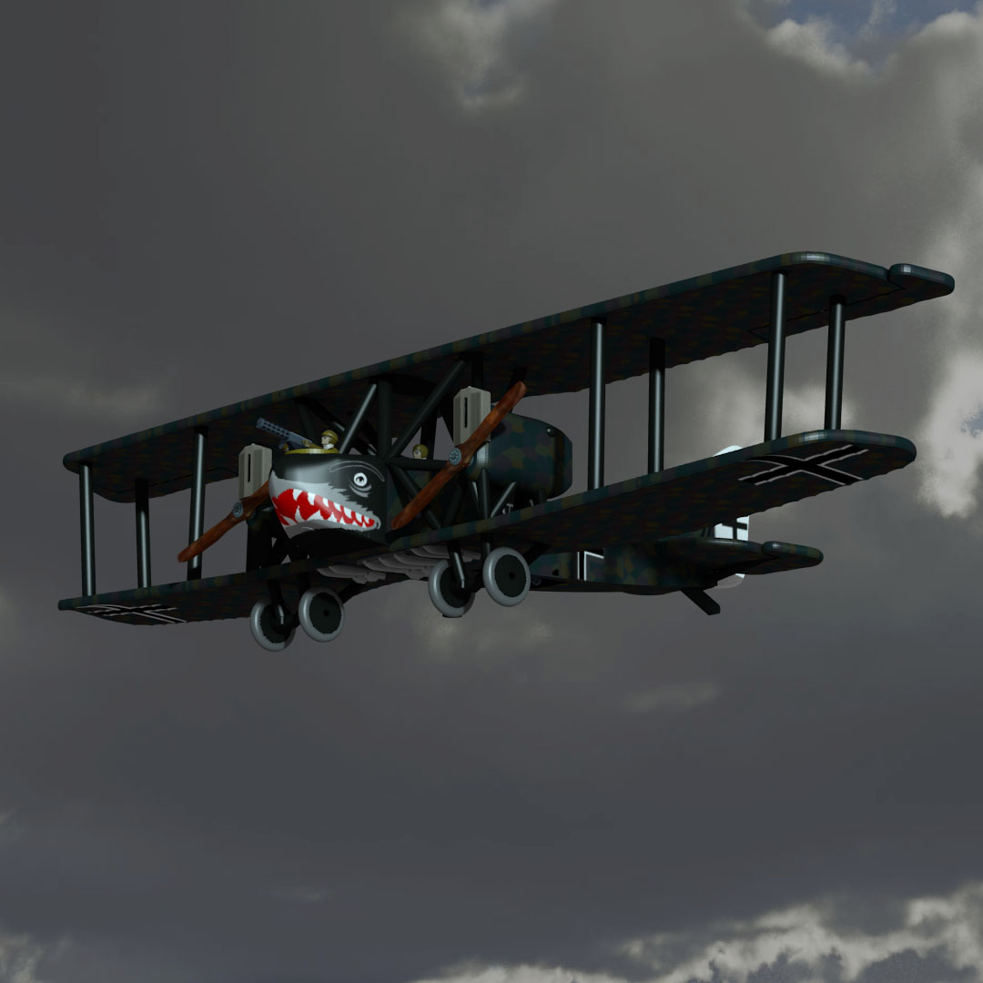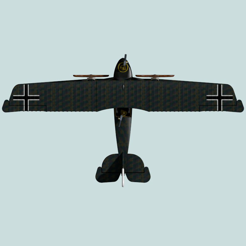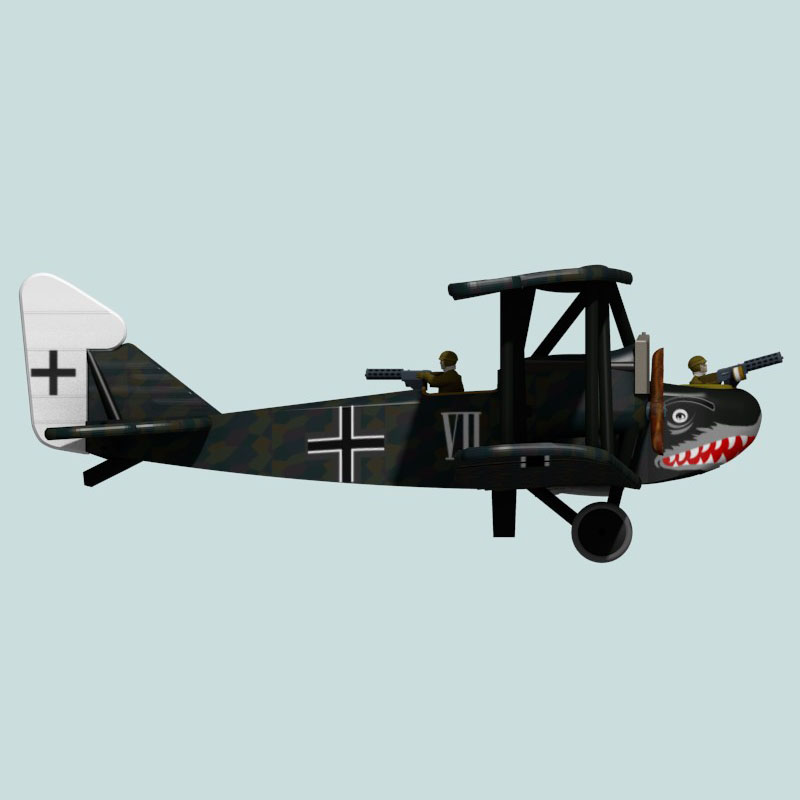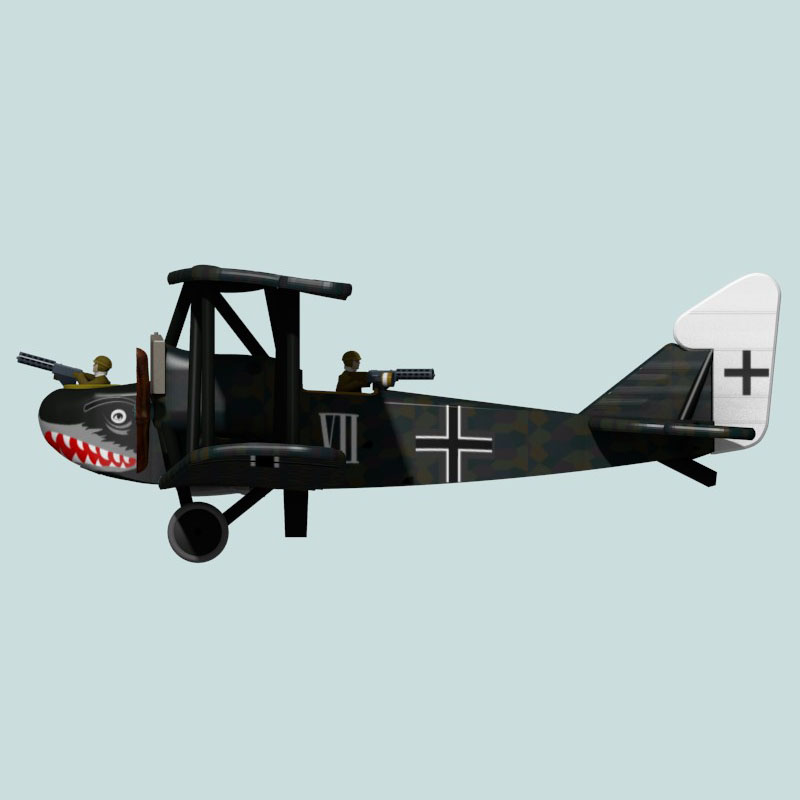 This is a full-color 1:144 3D print of an A.E.G. G.IV. We don’t know the unit or crew of this aircraft, but the shark motif on the nose is iconic. The fabric surfaces of the plane were covered in very dark five-color lozenge, which is either typical German lozenge painted over incompletely with a dark varnish or perhaps a special night print. By the time of this plane’s use — as shown by the narrow arms of the national insignia — the G.IV was flying only at dusk, night, and dawn hours.