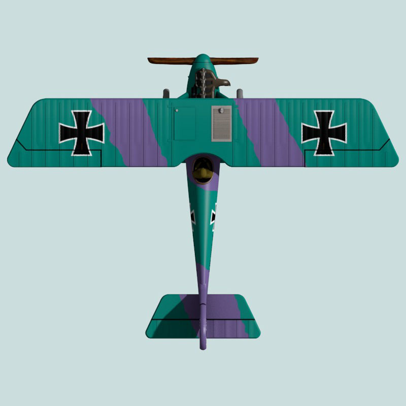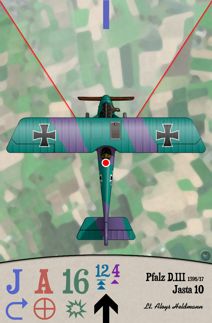 This is a full-color 1:144 3D print of Pfalz D.III 1395/17 of Leutnant Aloys Heldmann of Royal Prussian Jasta 10. Fifteen-victory ace Heldmann (also spelled “Alois”) joined the war effort in 1915 and served in the infantry on the Eastern Front. He gained his pilot license and flew two-seaters in the Balkans before joining Jasta 10 in June 1917. He survived the war and died in the 1980s.