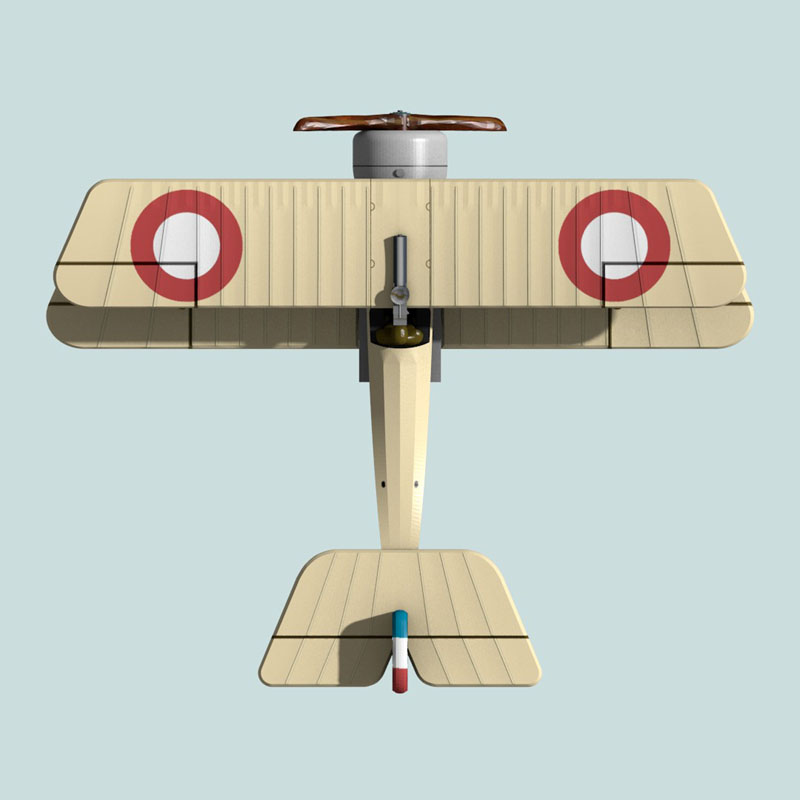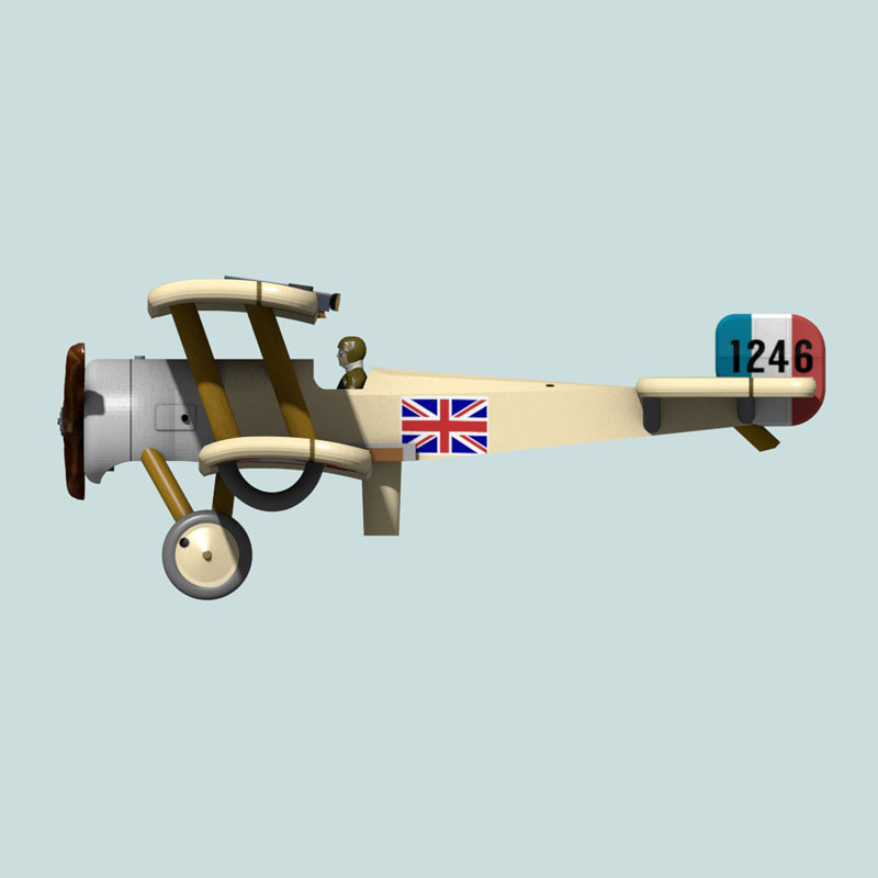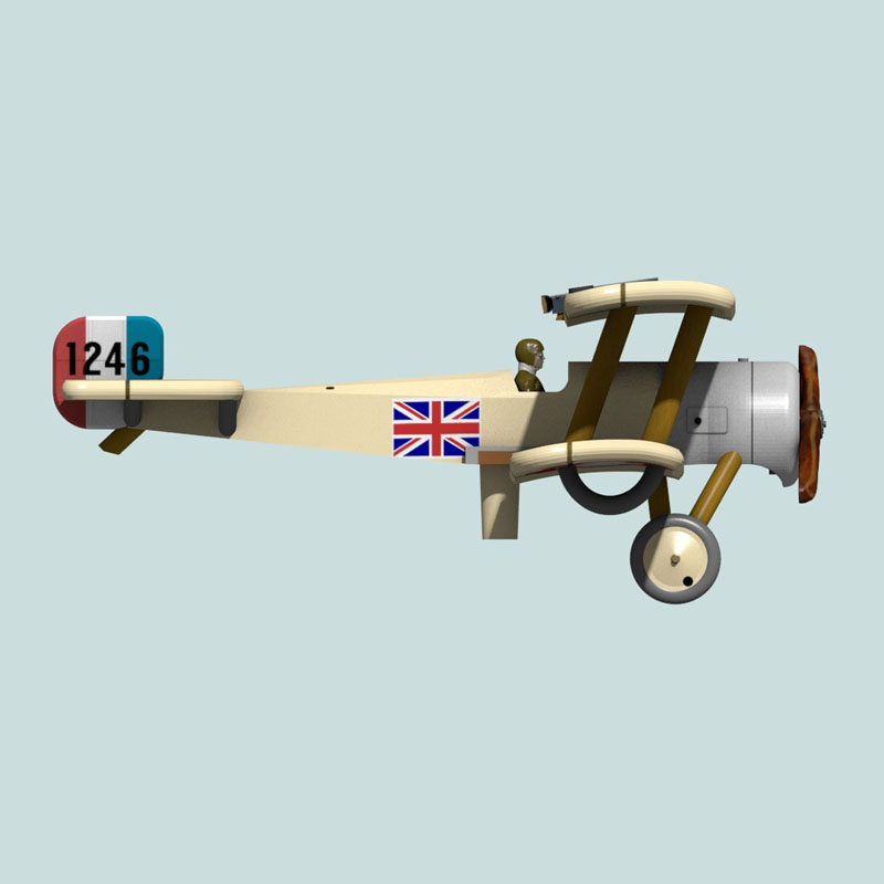 This is a full-color 1:144 3D print of Bristol Scout C #1246 of Royal Navy Air Station Eastchurch on the Island of Sheppey. Eastchurch is near the mouth of the Thames on England’s east coast. Coming from a period before U.K. airplane markings were standardized, this model features early red-ring roundels and the Union Jack. It has an unsynchronized top-wing Lewis gun and boxes for Ranken Darts on the fuselage sides, early anti-Zeppelin weapons.