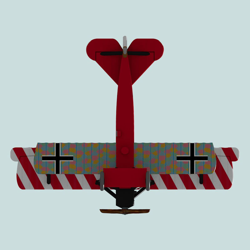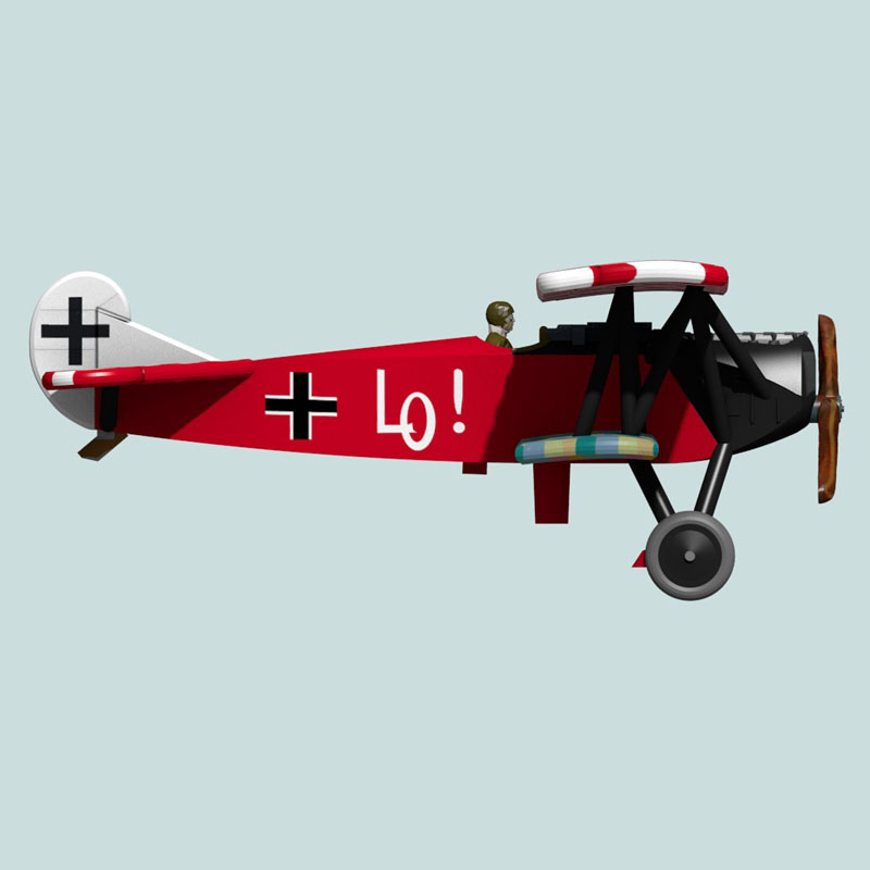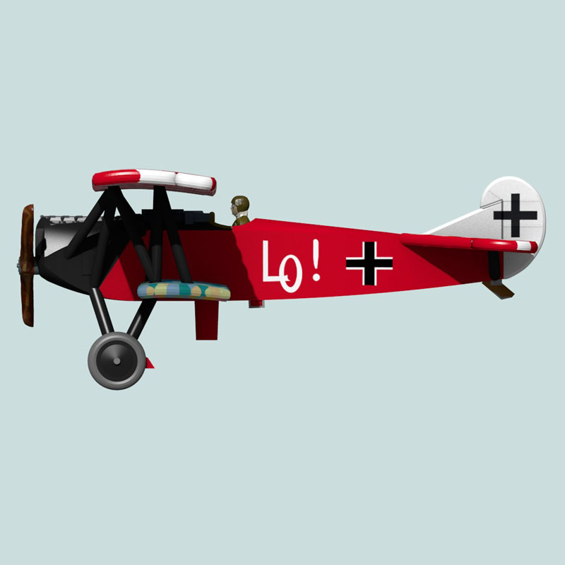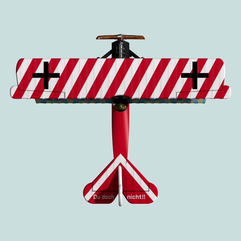 This is a full-color 1:144 3D print of the Fokker D.VII(O.A.W.) of Oberleutnant Ernst Udet of Jasta 4. This famous D.VII was probably only flown for a short time between roughly 18 June 1918 and 29 June 1918 when it was forced down by a Breguet 14. After losing this plane, Udet moved to a D.VIIF with a red fuselage, but the wing on that plane was either left with the original lozenge fabric or was painted solid red. It is unknown whether this D.VII had red nose, struts, and wheels or whether it retained the conventional Jasta 4 black, since both colors are very dark in period photographs. This model displays the latter. “Du doch nicht!!” on the elevators roughly translates to “It will not be you”, a little taunt to anyone who managed to get on Udet’s tail.  After losing this plane, Udet was given an Fokker D.VIIF.