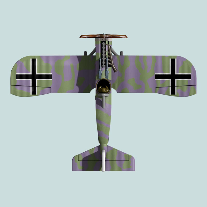 This is a full-color 1:144 3D print of Junkers J.I 5185/18. 5185/18 was believed to have been delivered to Marine-Feld-Jagdgechwader (MFJG) Belgium in October 1918, and we’re not sure how much service it saw before the Armistice, if any. The plane is finished in factory green with mauve camouflage painting by brush, and the underside is a white or pale blue.