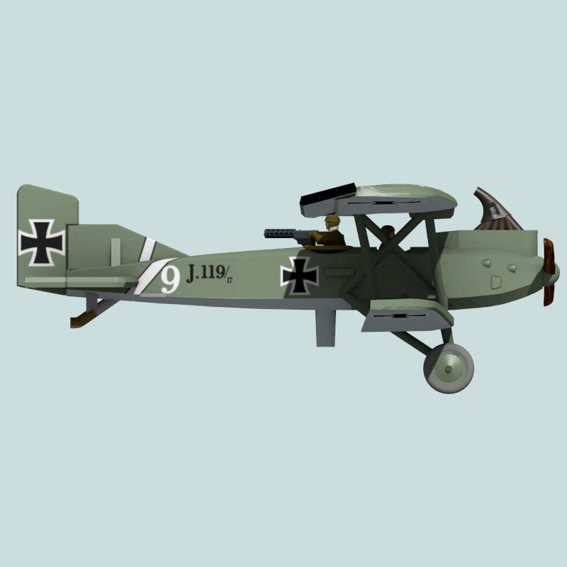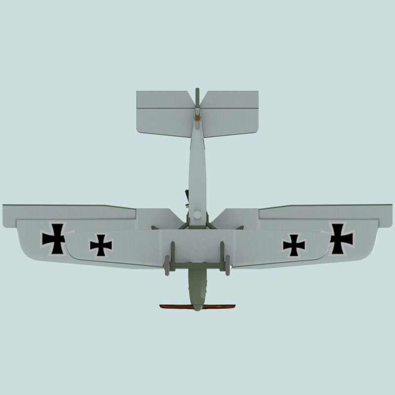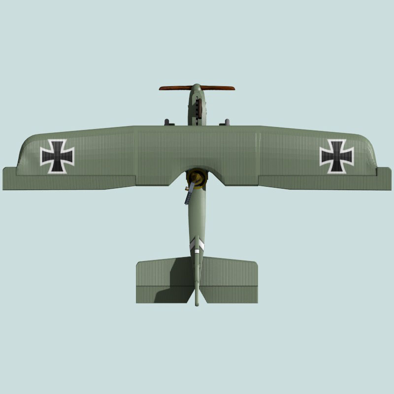 This is a full-color 1:144 3D print of Junkers J.I 119/17 of Flieger Abteilung (A) 217. Like all Junkers J.Is, the crew compartment and engine were heavily shielded by armor. Early J.I’s like this one featured an equal chord horizontal tail and fabric fin and rudder. This plane is painted solid medium green above and white-blue below, a common paint scheme for early J.Is.