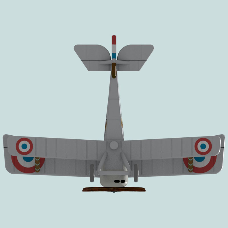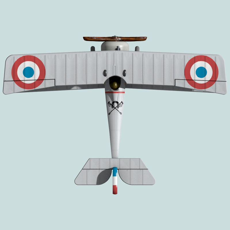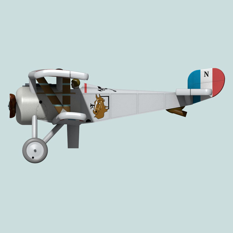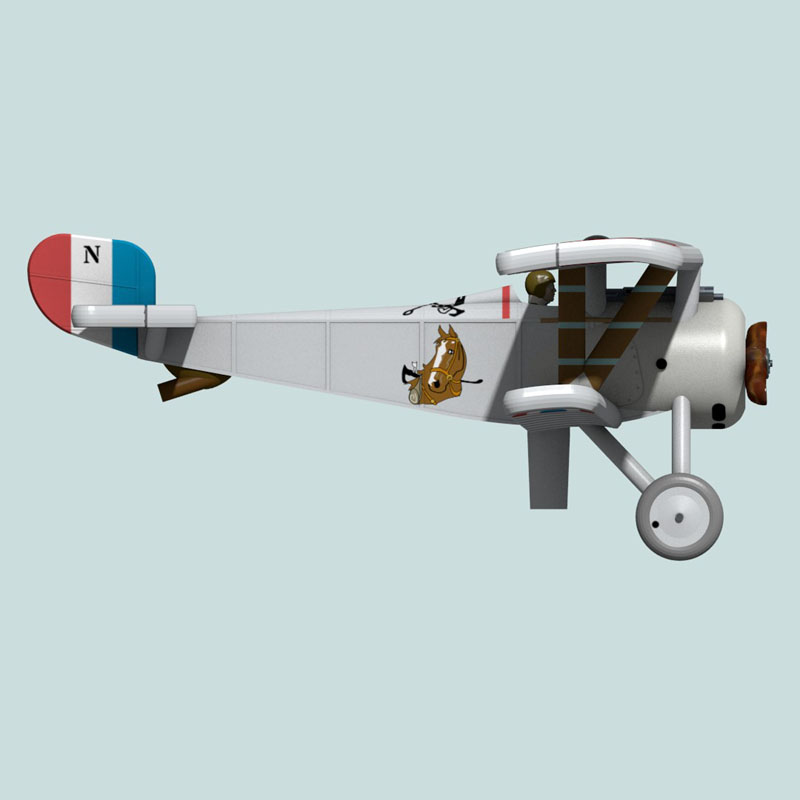 This is a full-color 1:144 3D print of the Nieuport 23 of pilot Kibanov of the Imperial Russian Air Service. This Nieuport 23 retains its French national markings, but the fuselage sides and top have been skillfully painted with equestrian images. Russian pilot Kibanov (given name unknown) was shot down near Minsk on 11 October 1917. The Nieuport 23 was basically a Nieuport 17 with the Vickers gun offset to the right to accommodate a different synchronizer.