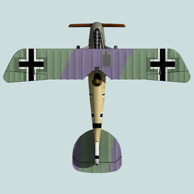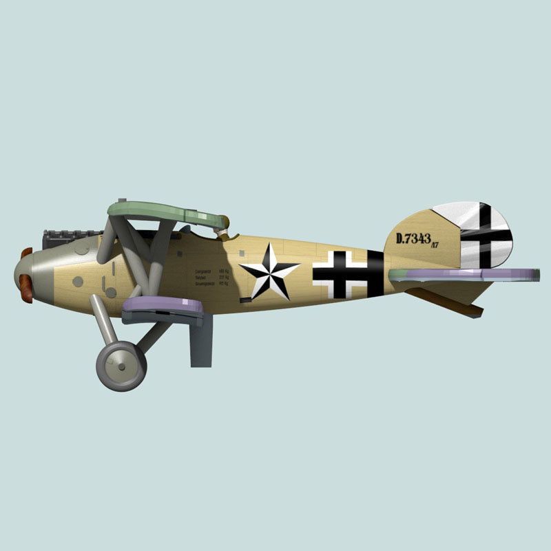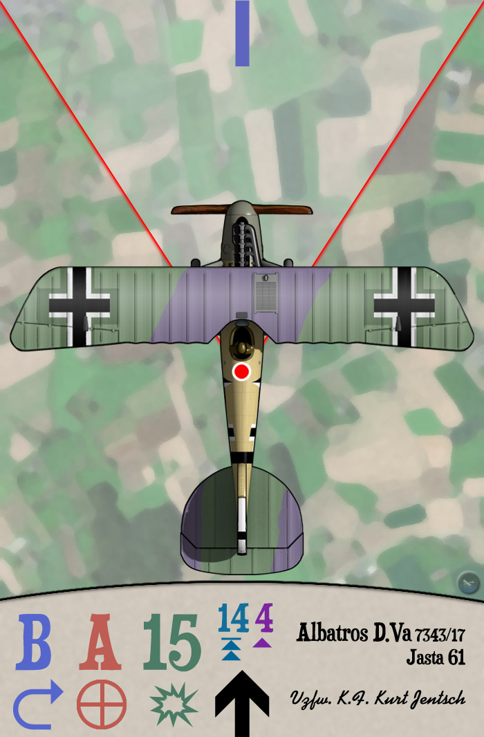 This is a full-color 1:144 3D print of Albatros D.Va 7343/17 of Vizefeldwebel Karl Friedrich Kurt Jentsch of Jasta 61. Jentsch moved around frequently during his flight career from 1916 to 4 Sep 1918, when he was wounded. He flew both two-seaters and single-seat fighters and scored victories in both (7 recognized and seven probables). The last of his probable victories was scored in this Albatros, which he flew in Jasta 61, bringing down a Breguet 14.