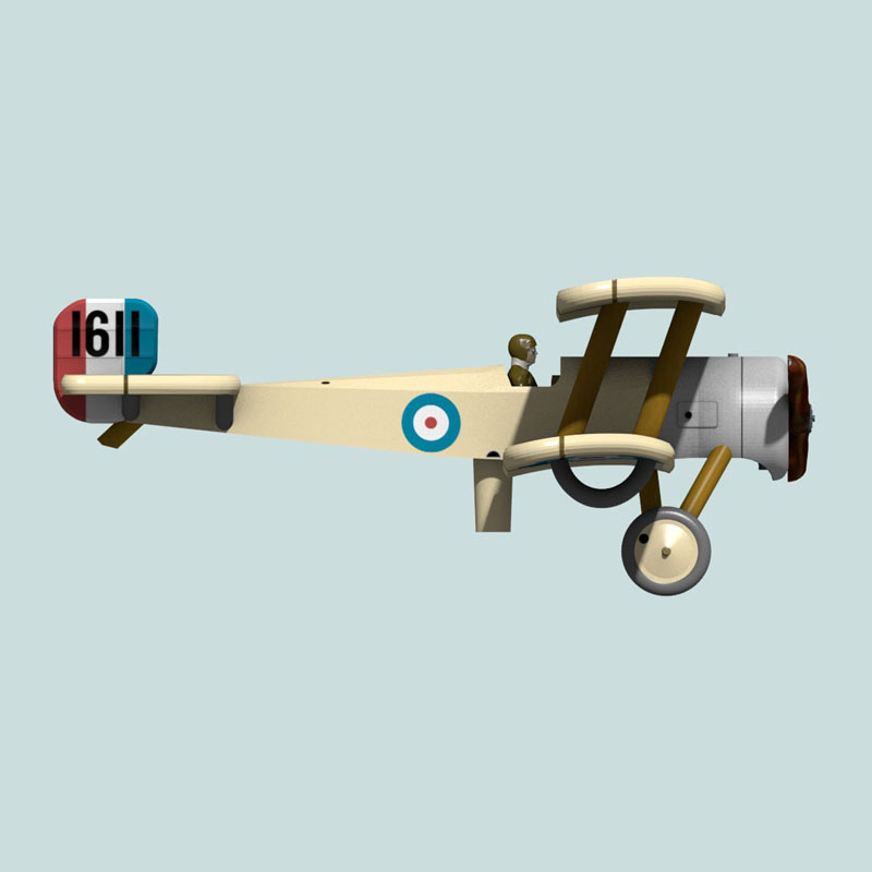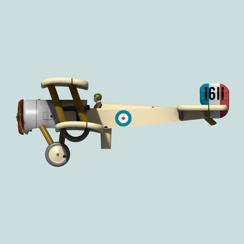 This is a full-color 1:144 3D print of Bristol Scout C #1611 of Major Lanoe George Hawker of No. 6 Squadron RFC. Hawker was one of the earliest pilots in France, flying Henri Farman aircraft in October 1914. Hawker later devised a way to mount a Lewis machine gun at an angle to his Bristol Scout (this aircraft) such that the stream of bullets missed the propeller arc, a necessity in the pre-synchronizer days. In doing so, he may have become the RFC’s first fighter pilot and first ace. In #1611 he scored two victories on 25 July 1915, for which he was awarded the Victoria Cross. He scored a total of seven air victories until he was shot down while flying an Airco D.H.2 against Manfred von Richthofen on 23 November 1916.