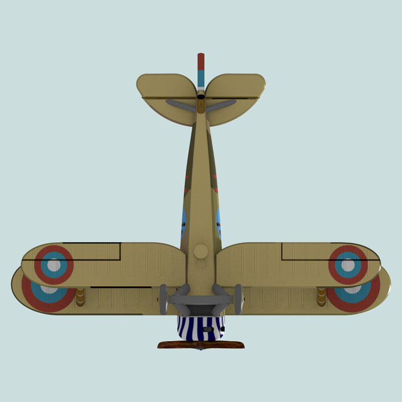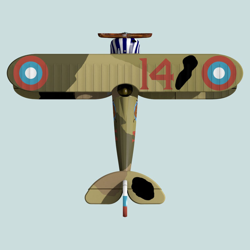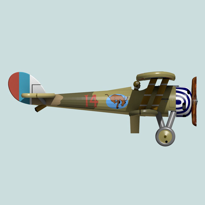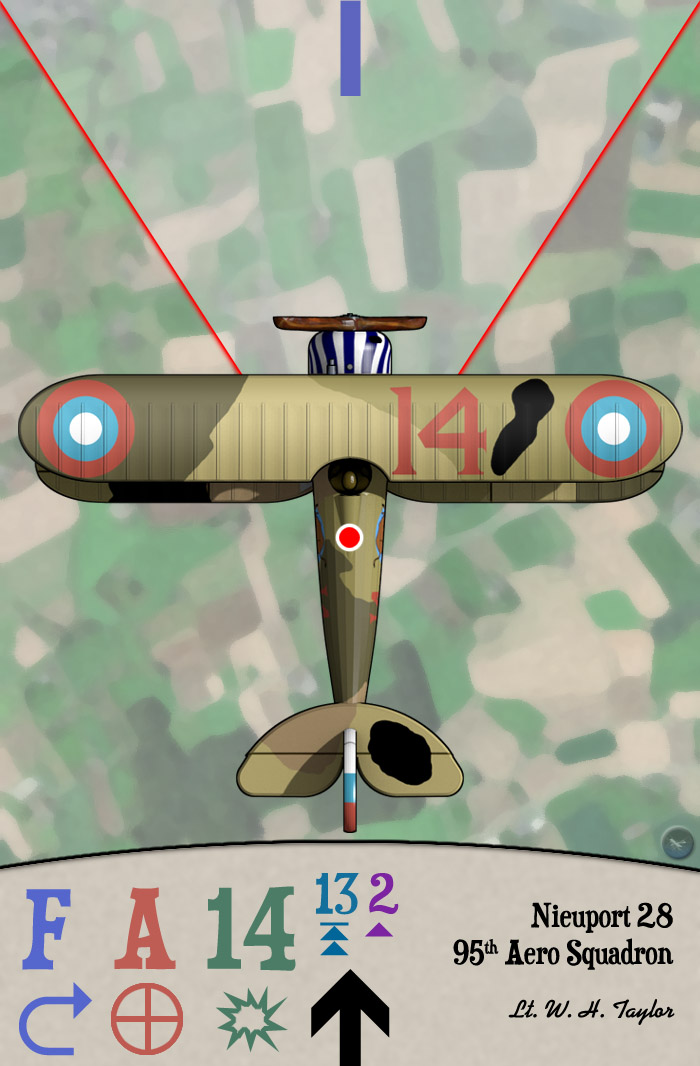 This is a full-color 1:144 3D print of the Nieuport 28 of Lieutenant W. H. Taylor of the 95th Aero Squadron, U.S. Air Service. The 95th’s emblem was the kicking mule, and C flight used a concentric rings design on the plane’s cowl in either dark blue or black.